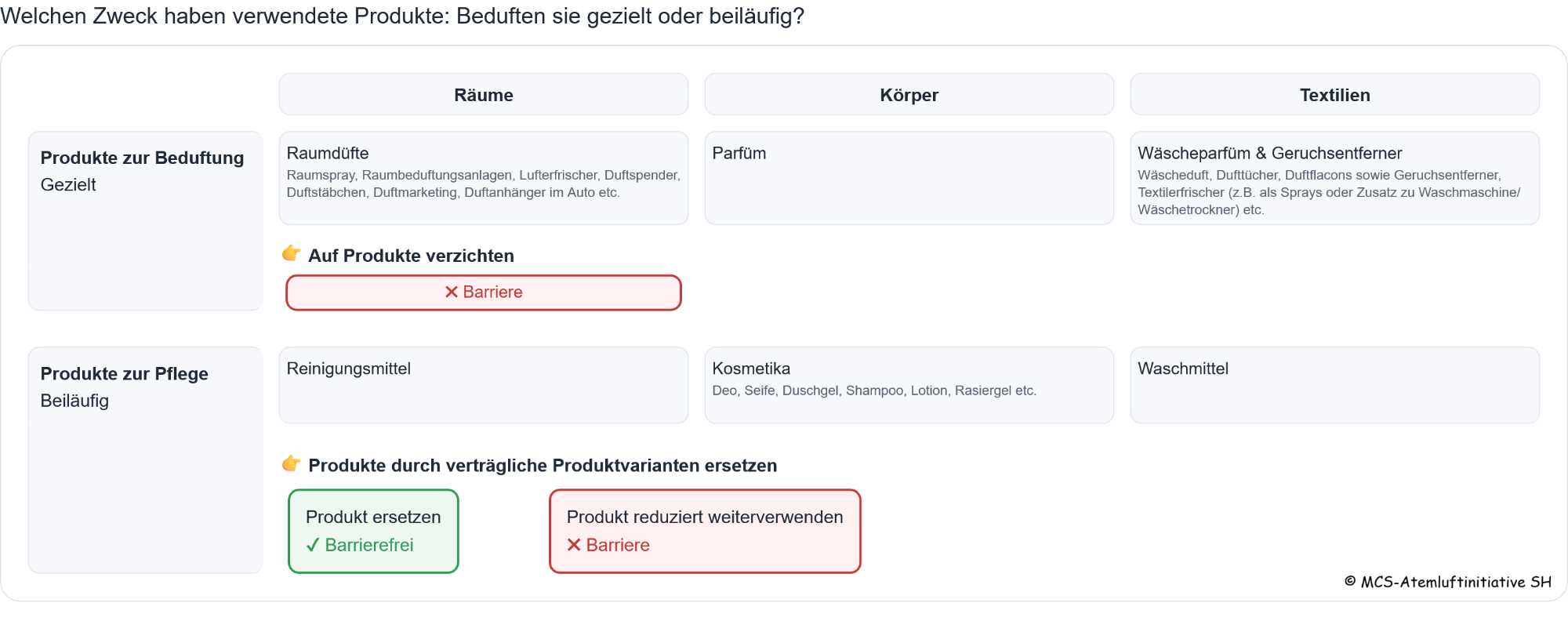 Auch für das Einatmen gilt: „Nur Ja heißt Ja“ – immer und überall. - Kaufe keine dufthaltigen Produkte mehr: Kaufe stattdessen nur noch duftfreie Produkte.
